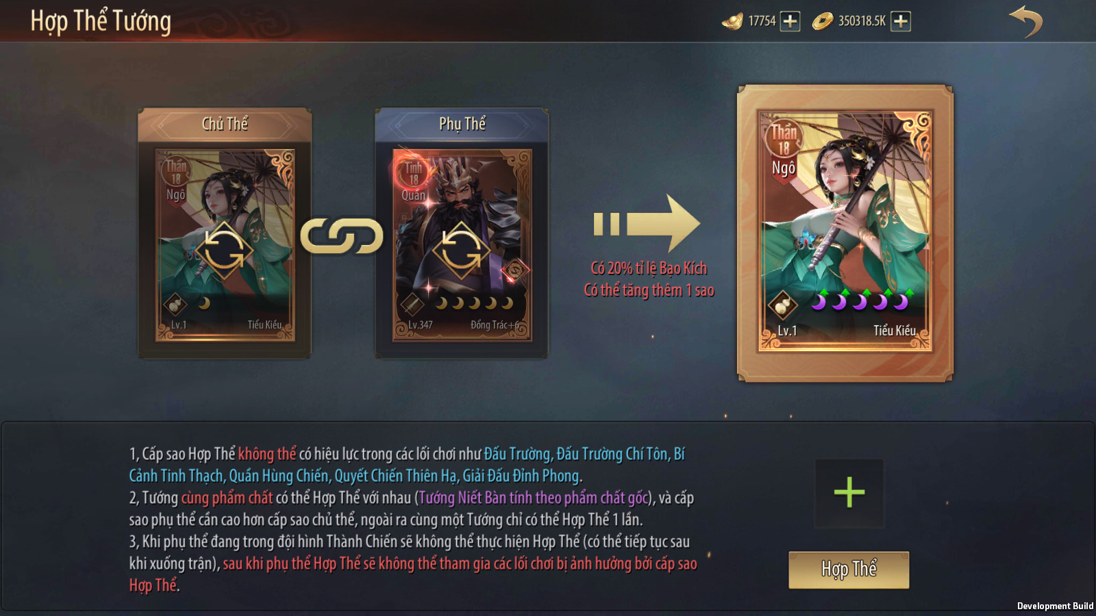 Khi hợp thể, cần thiết lập Tướng Chủ Thể và Tướng Phụ Thể. Tướng Chủ Thể sẽ nhận cấp sao cao nhất trong hai tướng, đồng thời có xác suất tăng thêm 1 sao (xác suất tăng theo sao cơ bản của cả hai tướng).