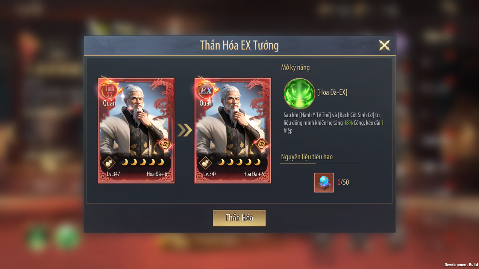 Các Danh Tướng tư chất 22 trở lên đủ điều kiện có thể Thần Hóa, giúp tăng mạnh sức mạnh tướng, nâng cao khả năng sử dụng của các Danh Tướng tư chất tốt.