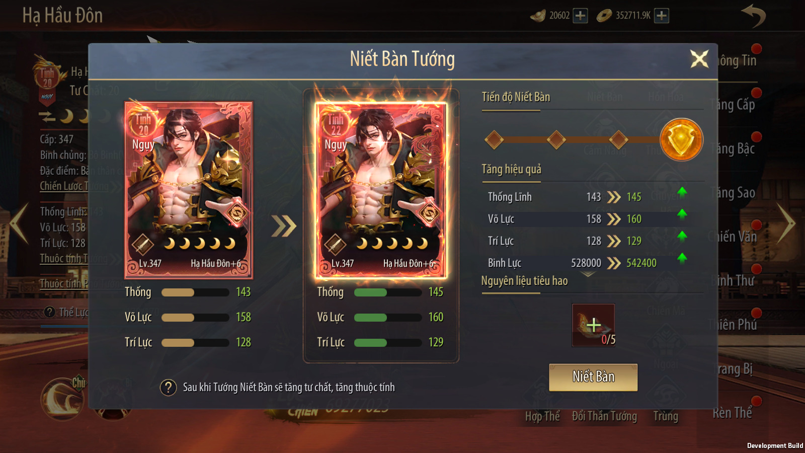 Tướng có tư chất 18 hoặc 20, sau khi đạt 8 sao có thể mở tính năng Niết Bàn, tiêu hao một lượng nhất định Tàn Tro Niết Bàn để nâng tư chất tướng lên 22.