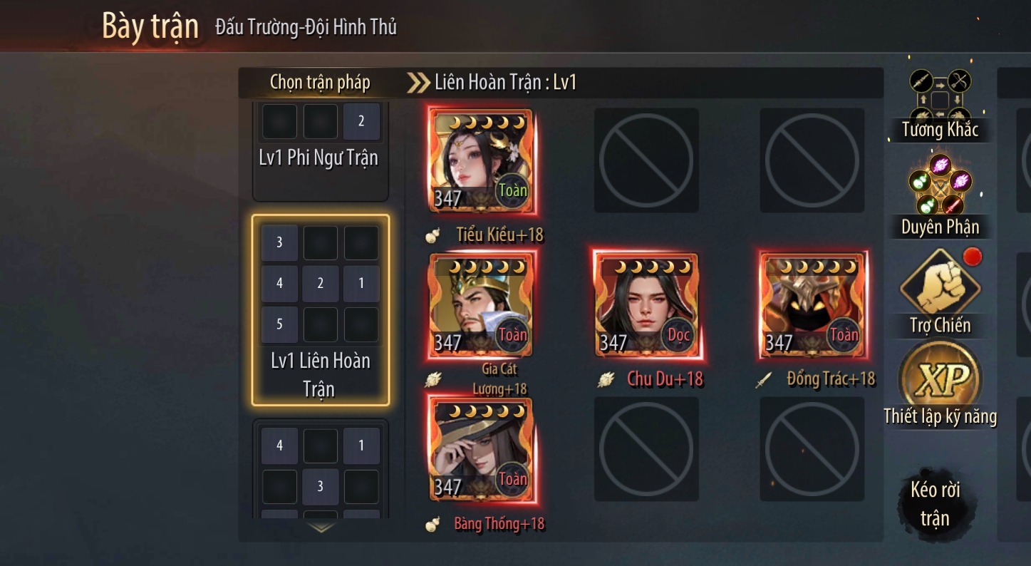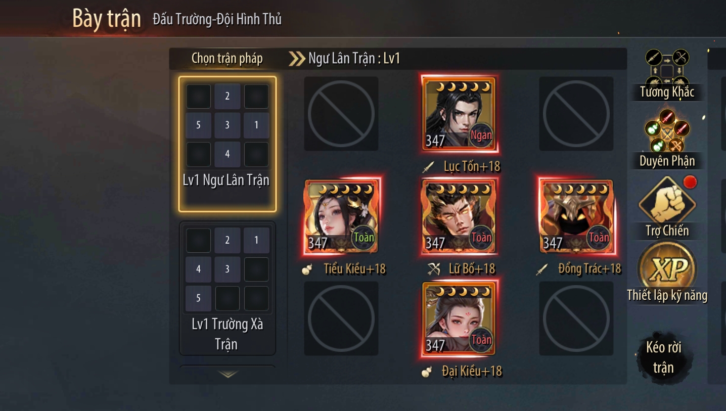 - Đội hình B: Lục Tốn – Đổng Trác – Lữ Bố – Tiểu Kiều – Đại Kiều.