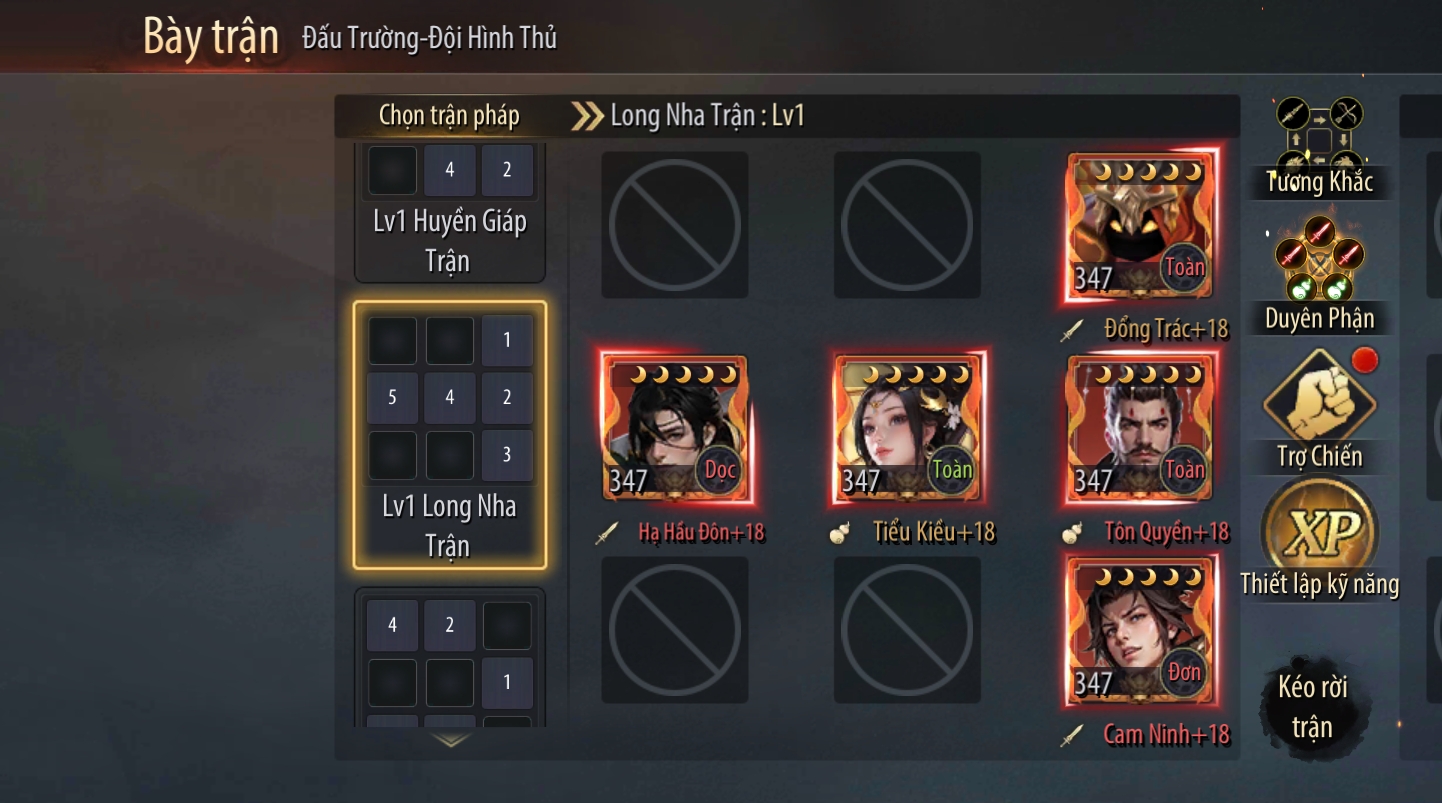- Đội hình S: Đổng Trác – Hạ Hầu Đôn – Tôn Quyền – Cam Ninh – Tiểu Kiều.