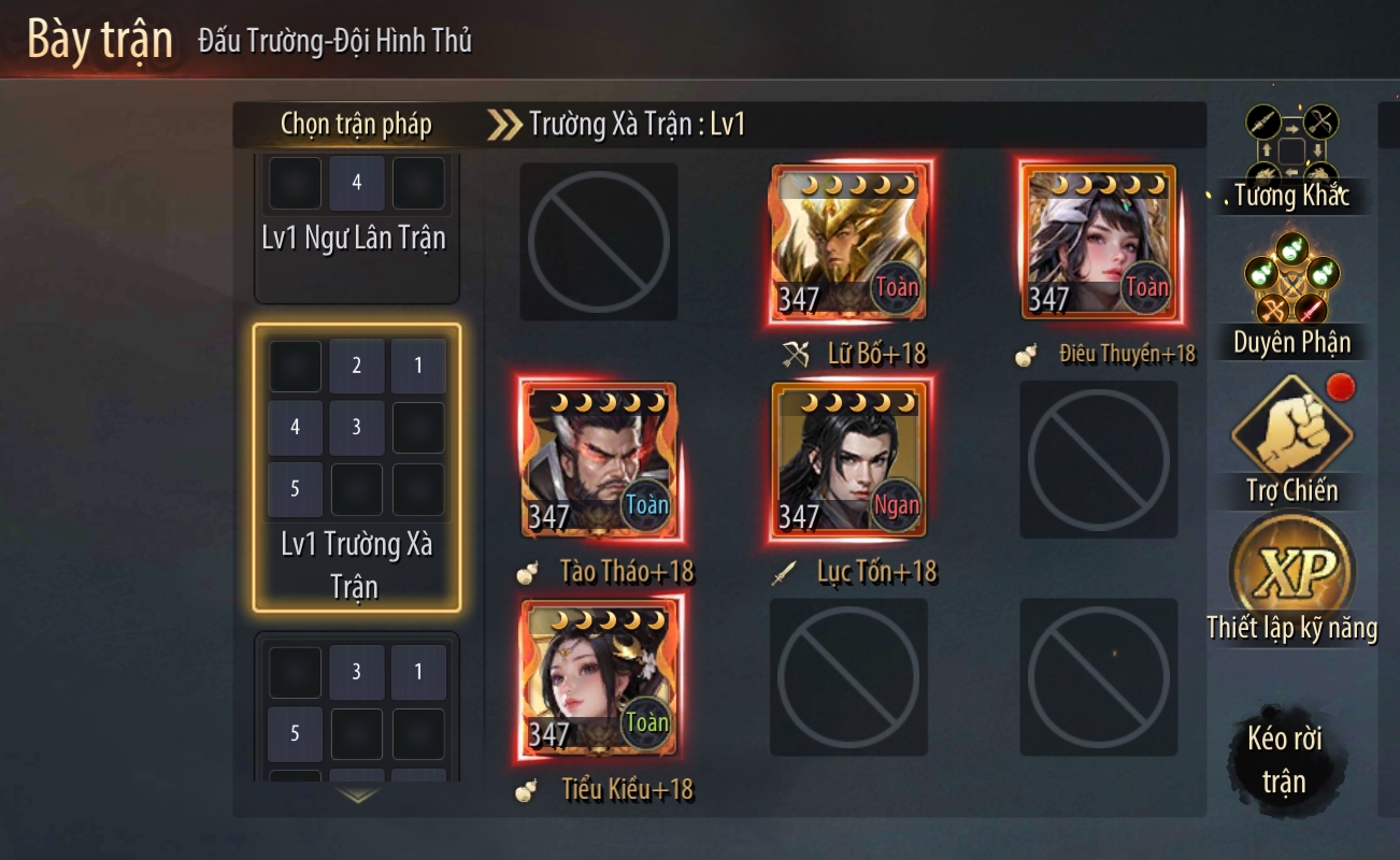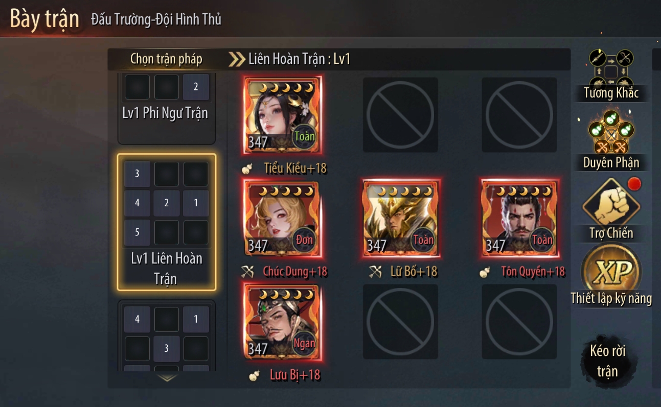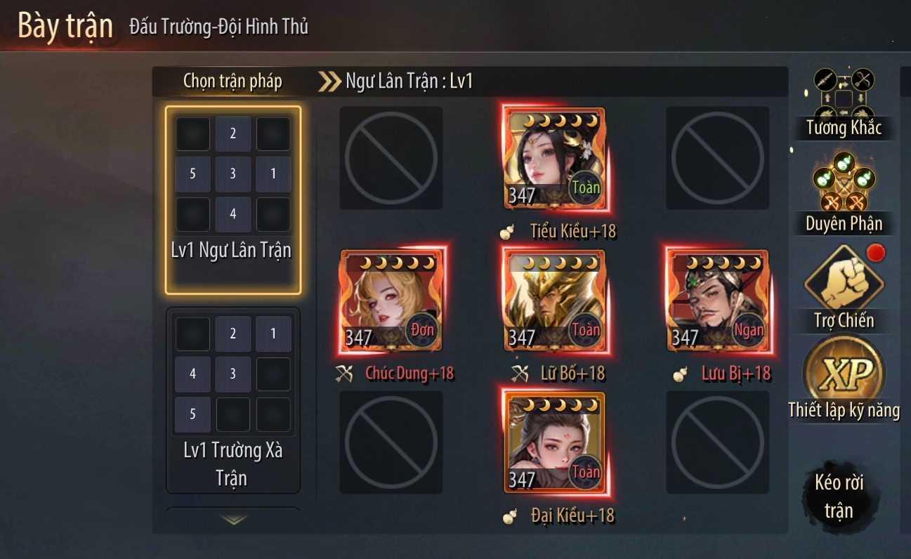- Đội hình S: Tiểu Kiều – Tôn Quyền – Lưu Bị – Lữ Bố – Chúc Dung.