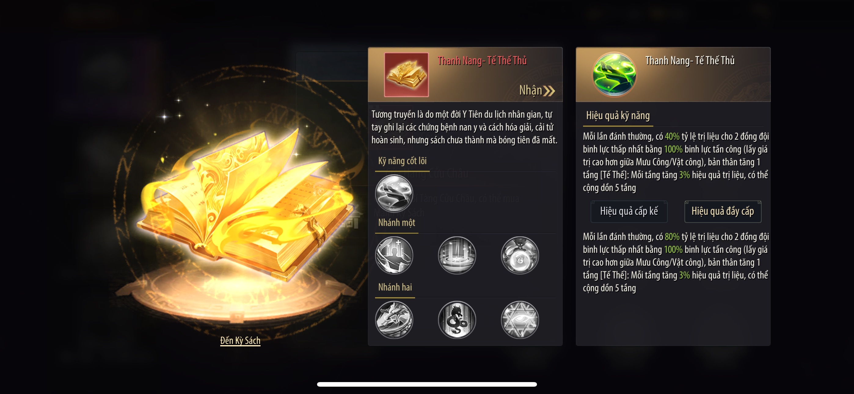 - Kỳ Sách tăng mạnh khả năng sống sót nhờ tăng thủ, né tránh và xóa hiệu ứng bất lợi, đồng thời sau mỗi lần tung nộ khí hoặc khi đồng đội Bạo Kích sẽ kích hoạt tự hồi phục, giảm sát thương và hồi binh lực toàn đội. Kèm hiệu ứng cấp cứu khi máu thấp, giúp đội hình trụ giao tranh lâu hơn.